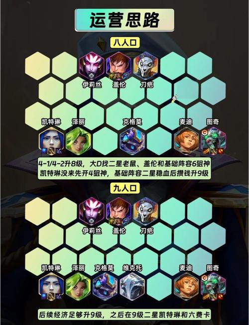 主C女警:巨人捕手、飓风、无尽之刃,以暴力输出为主。副C杰斯:根据剩余装备灵活搭配。坦克卡密尔/猪妹:石像鬼板甲、泰坦、龙牙、救赎/狂徒,主要承担防御任务。运营思路:前期:采用连败运营,快速积累金币,31时全部搜光追3星女警和卡密尔。