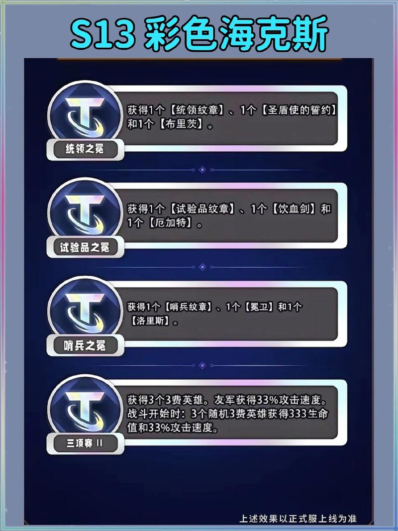 因为星界赐福、狩猎律动这种海克斯属于中立的。但海克斯也分稀有 度的,有白的金的还有彩色的,有的时候你场.上的羁绊所对应的海克斯在当前稀有度的海克斯里面是没有的,自然就会给你别的海克斯。每局对弈中,你将选取三次海克斯强化,辅助你的策略执行,引领你走向胜利。