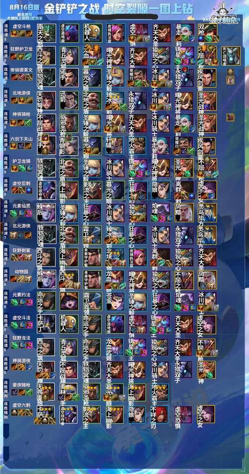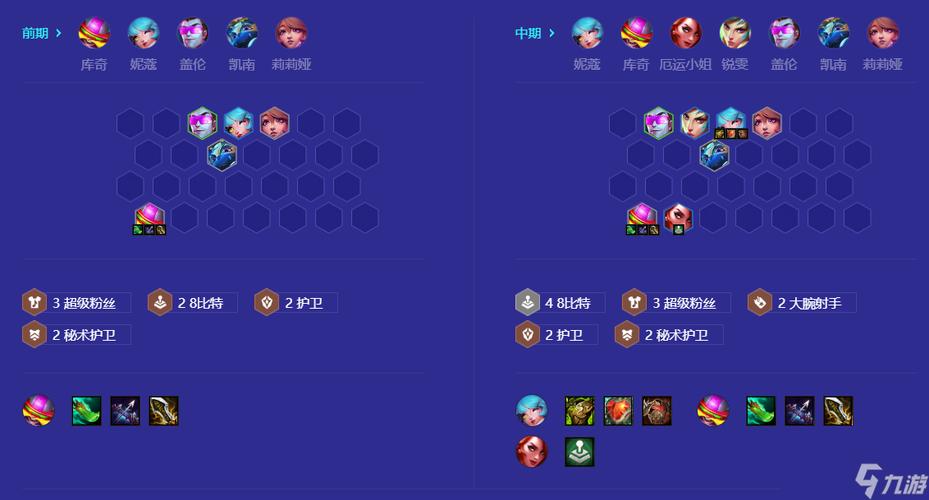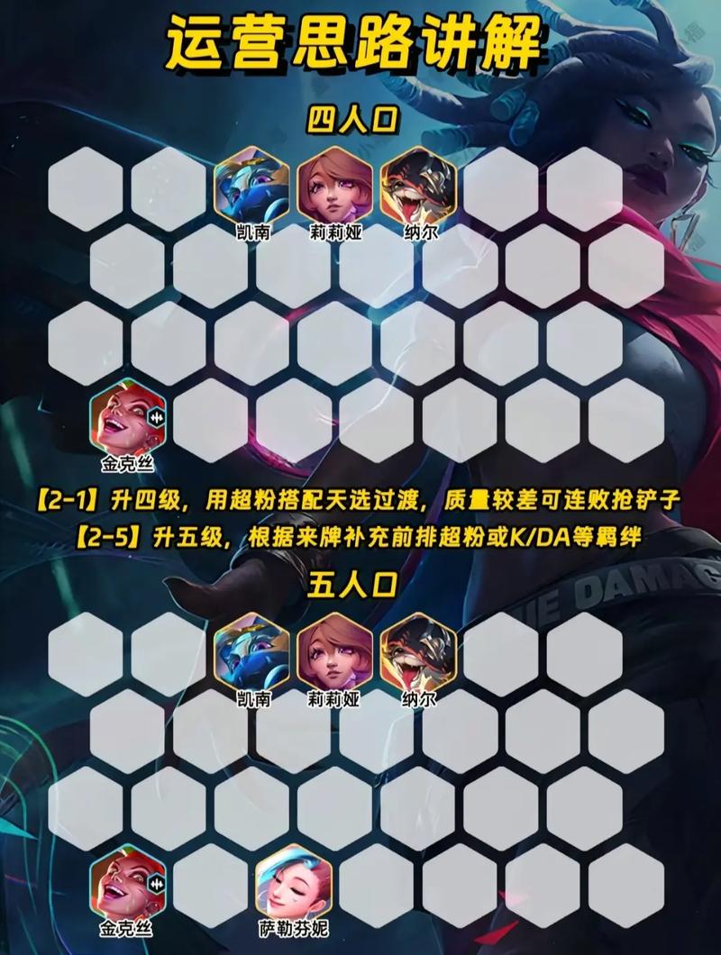 〖Two〗、多才多艺: kda法师萨勒芬妮: 7kda法师阵容,适合9人口时补琴女或狐狸天选,装备上注重主C输出和法抗。 五杀刀锋天使: 7五杀阵容,注重装备合成,天使为核心,佛耶戈做副C,6人口时要灵活调整。 朋克裁决老鼠: 4朋克6裁决阵容,依赖朋克羁绊快速拿牌,后期上人口补伤害。