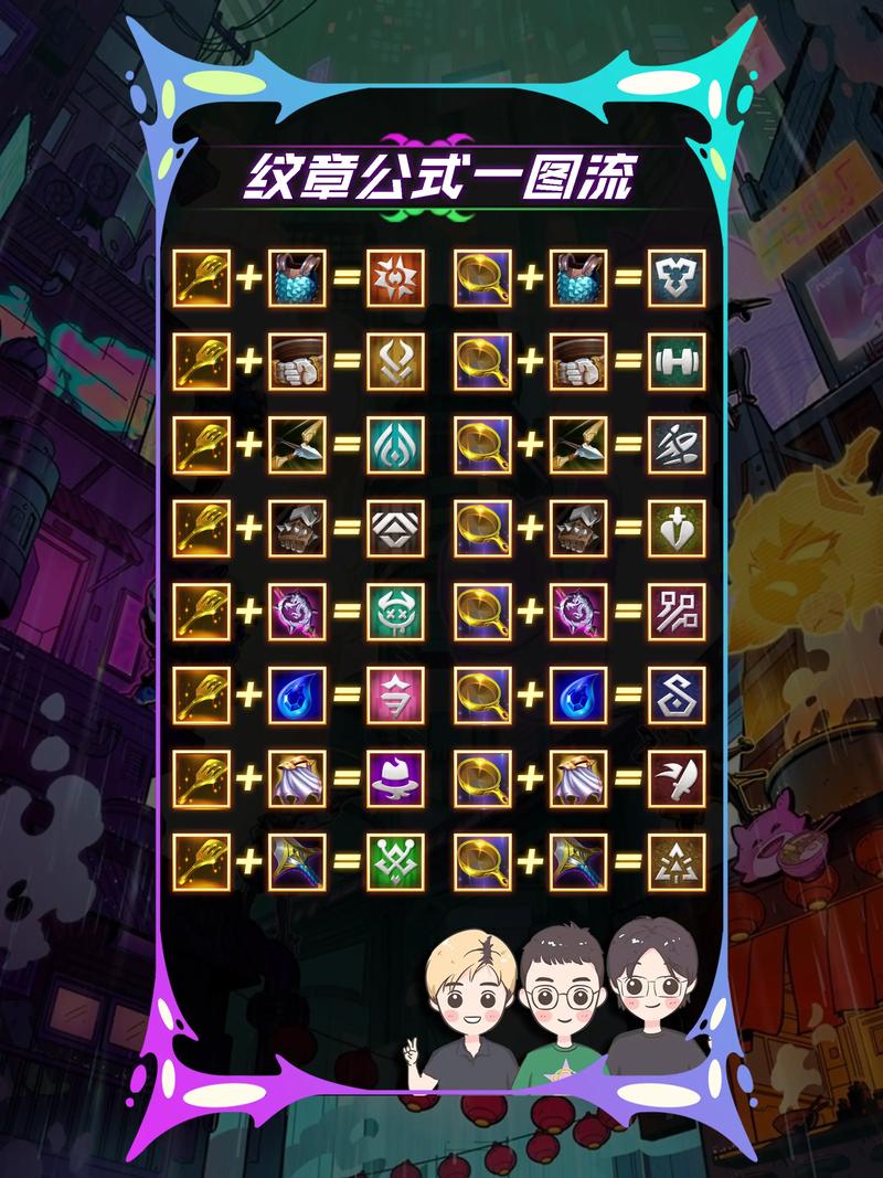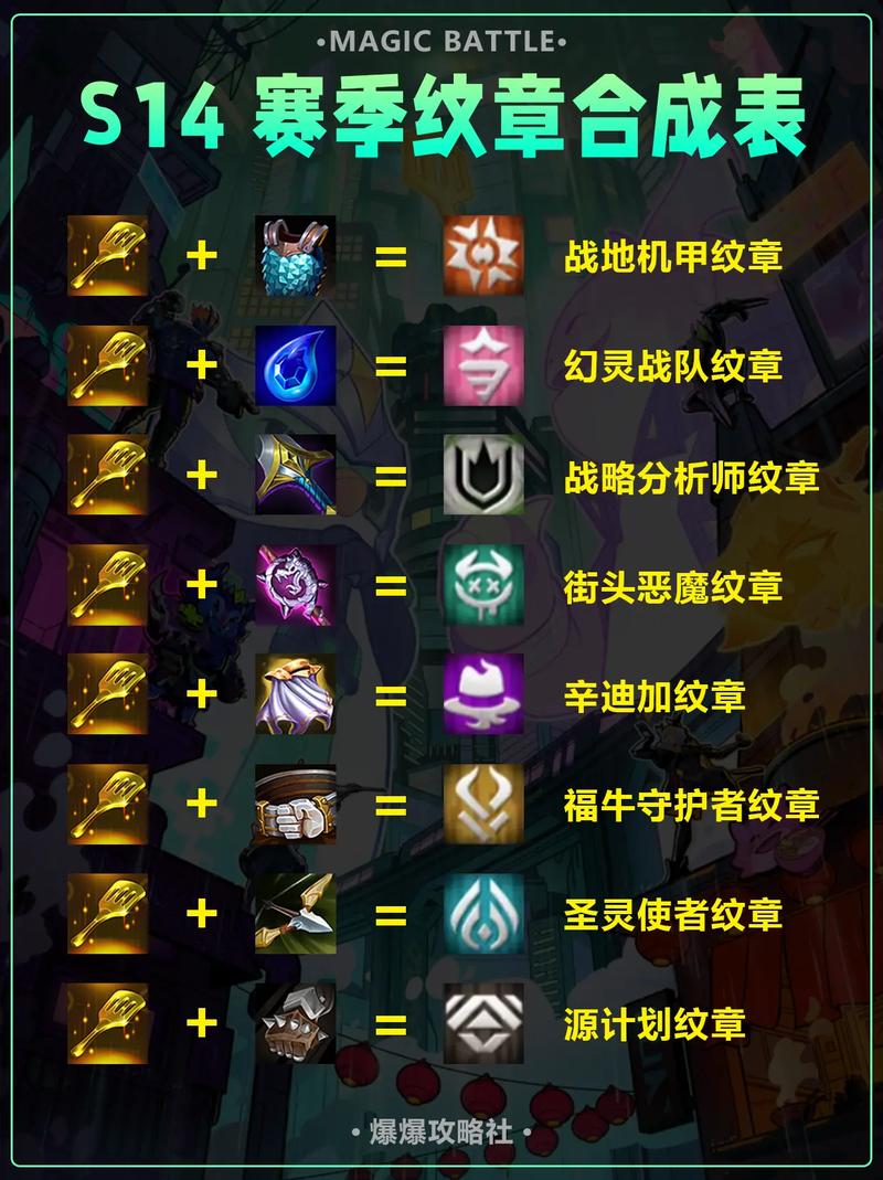 合成公式:金铲铲 + 女神之泪 效果:携带者成为星之守护羁绊的一员。暗星之心 合成公式:金铲铲 + 拳套 效果:携带者成为暗星羁绊的一员。刺客的利爪 合成公式:金铲铲 + 反曲之弓 效果:携带者成为刺客羁绊的一员。