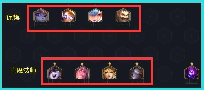 〖Four〗、触发羁绊:3怒翼龙、2屠龙勇士、2幽影龙、2神龙尊者、2格斗家、2护卫、2换形师、2狂刃战士,共8个羁绊。7人口时特定英雄组成的阵容 阵容特点:在7人口时,通过选取如皇子等英雄来补足关键羁绊。触发羁绊:包括2堡垒、2斗士、2杀手、2福牛、2重装、2工程师、2赛博老大、2圣灵,共8个非唯一羁绊。