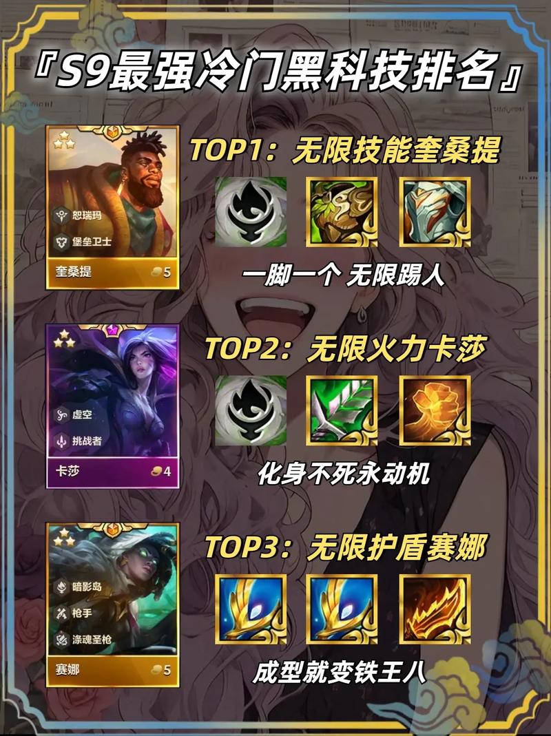 〖Six〗、《金铲铲之战》S9赛季更新内容如下:赛季主题与宝典系统 符文大陆传奇宝典:免费获取经验值解锁奖励,豪华宝典需7900点券购买,售卖至2023年9月14日。排位赛季重置:所有玩家段位重置至【坚韧黑铁 II】,完成5场定级赛后前四名可获额外胜点,【狂暴模式】积分重置为500。