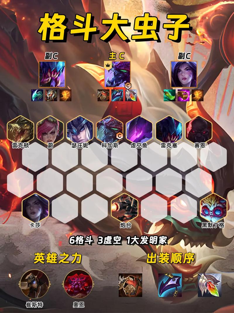 〖One〗、阵容介绍: 核心羁绊:五杀摇滚与刀锋领主。五杀摇滚羁绊提供伤害减免和额外伤害,击杀敌方弈子后还能提升攻击速度。刀锋领主羁绊则提供攻击速度加成,并能越过前排攻击敌方后排。 主C选取:佛耶戈,技能攻击力收益大幅提升,且技能范围大,能威胁到敌方后排弈子。