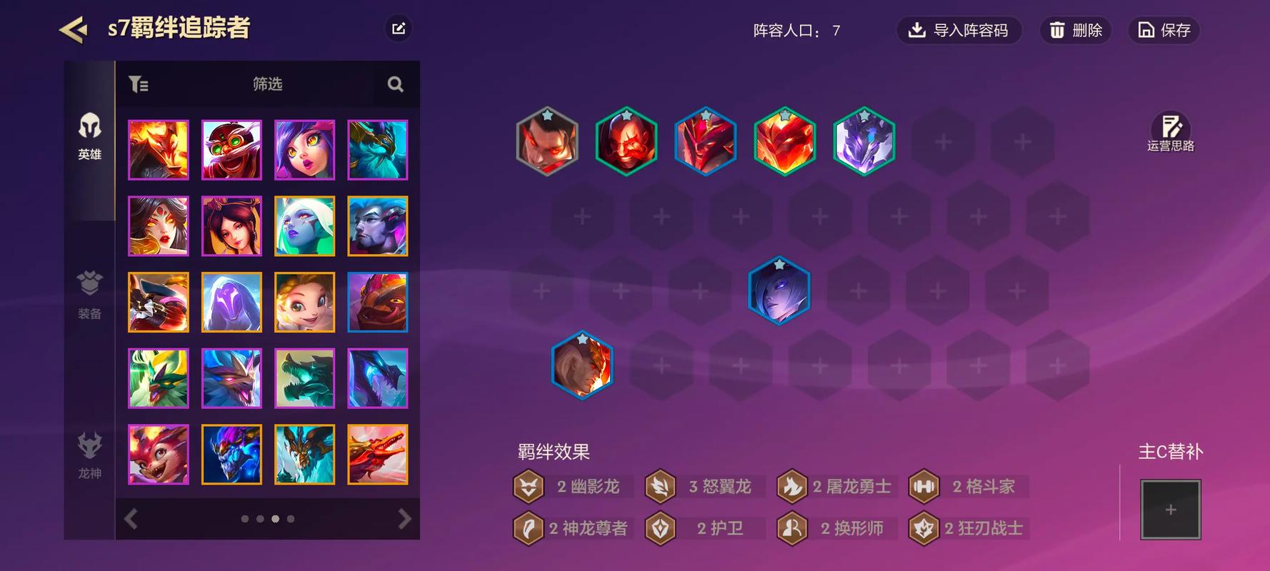 阵容组成:奈德丽(豹女)、纳尔、洛、石傲玉、杰斯、索拉卡、希瓦娜。阵容羁绊:5玉龙、4怒翼、4换形、2秘术、2龙神、1冒险家、1唤星者。转职推荐:秘术纹章、玉龙纹章、怒翼龙纹章。