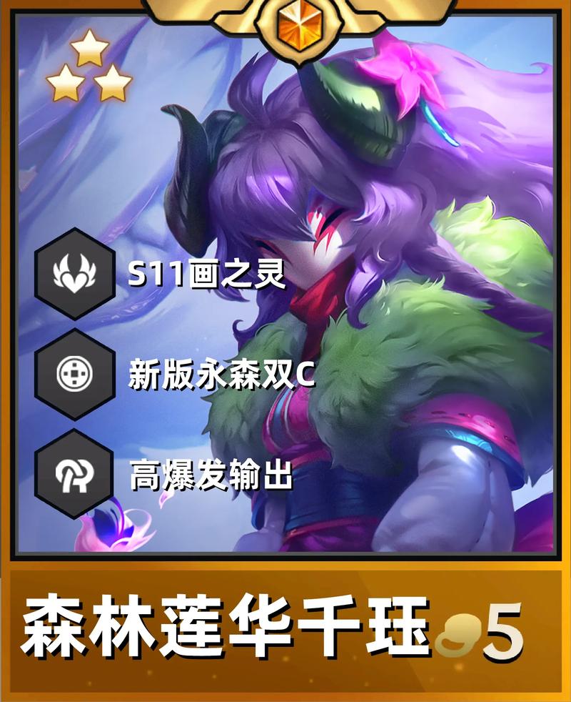 〖Five〗、天将95:开局若获得天将卡、天将纹章或神圣刷新,可尝试此阵容。无幽魂纳尔同行,追出3星凯隐相对容易。前期使用2星德莱厄斯+汲取剑+夜之锋刃过渡,2星德莱厄斯表现出色。中后期上限为2星5费卡,面对大肉对手时,单挂丽桑卓会有惊喜。