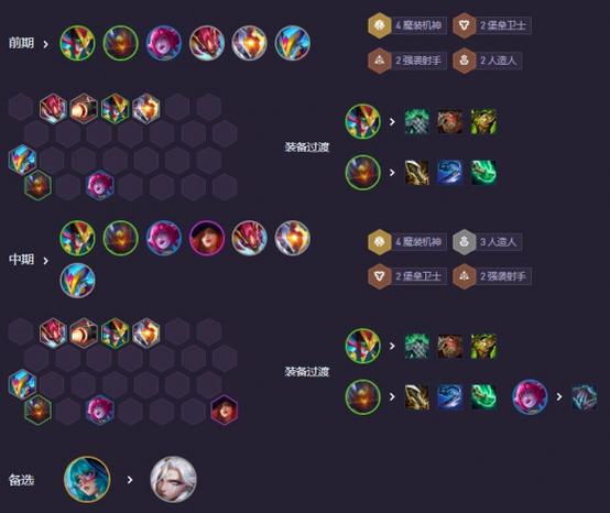 〖Four〗、前期过渡阵容 阵容组成:豹女、龙女、俄洛伊、阿萝拉、千珏、萨勒芬妮、蜘蛛。羁绊组成:4魔装机神、3幻灵、2人造人、2工程、2堡垒。这样的羁绊组合在前期能够提供较强的战斗力和生存能力。装备推荐:阿萝拉:鬼书(提供法术灼烧效果)、头盔(增加生命值和魔抗)、帽子(提升法术强度)。