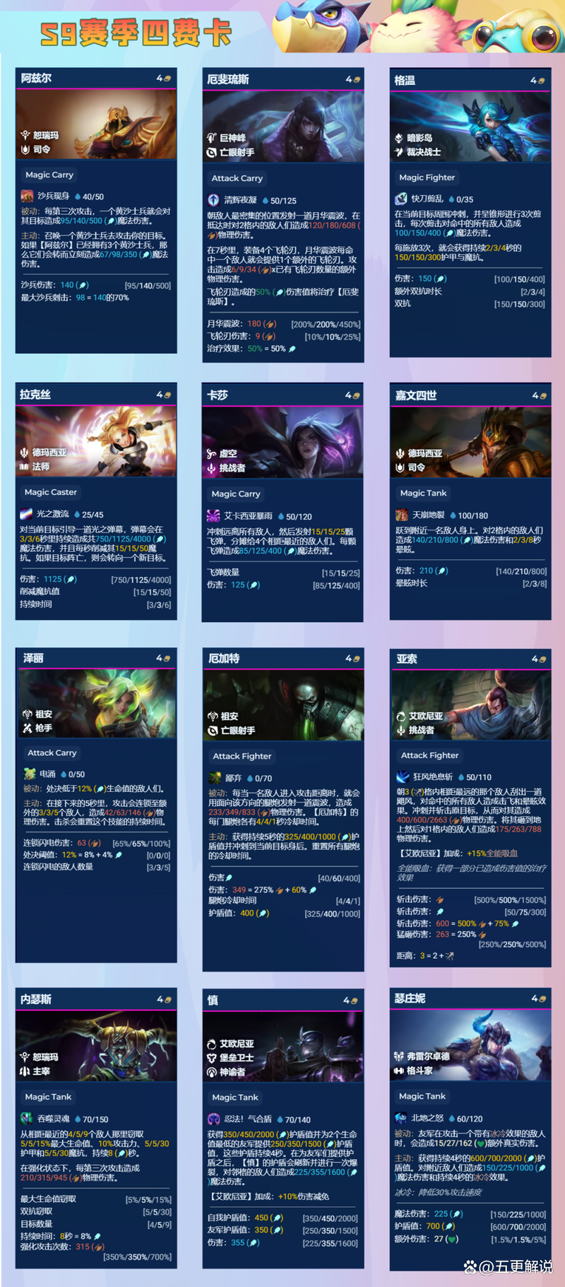 金铲铲之战S9五费卡包括:瑞兹、赛恩、黑默丁格、阿狸、卑尔维斯、赛娜、亚托克斯和奎桑提。这些五费卡各有其独特的技能和羁绊效果。例如,黑默丁格能够对敌人投掷手雷,造成范围伤害和眩晕效果,同时还拥有炮台的特色玩法。赛娜则能发射巨型光束,对最远距离的敌人造成物理伤害,并为命中的友军提供护盾。