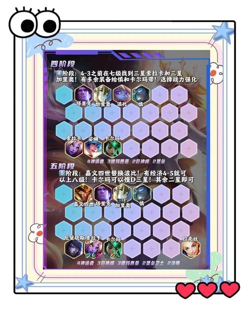 〖Six〗、劫,金铲铲之战中的常青棋子,在天选福星模式中大放异彩。如今,小编特此总结出金铲铲之战明昼劫的阵容攻略,助你在游戏中游刃有余。阵容搭配以4灵魂莲华明昼、3秘术师、3战神、2刺客、1忍者为框架,羁绊组合增强战力。强化符文选取羽量级选手、不灭的愤怒、战亦有道,提升整体战斗力。
