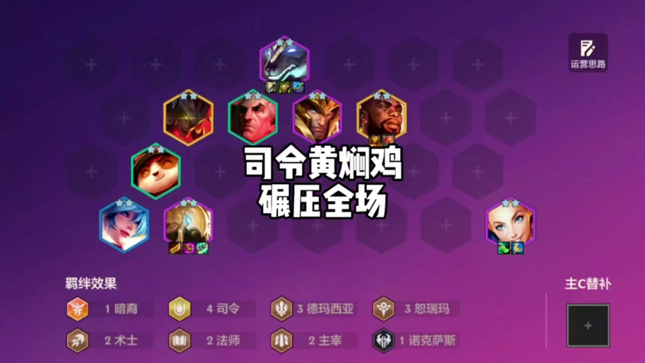 〖Two〗、阵容搭配 阵容由霞,瑟提,凯隐,乌鸦,人马,龙女,亚索,慎,组成。阵容的主要c为是霞,副c是龙女,然后还有一个亚索。