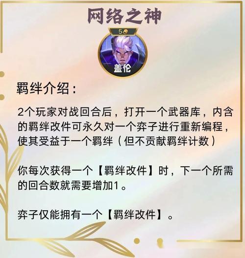 〖Three〗、要在金铲铲之战中快速开启羁绊追踪者,可以采取以下方法: 熟悉棋子与羁绊 基础了解:首先,玩家需要深入了解每个棋子的特性和它们所属的羁绊。这是构建高效队伍的基础。 羁绊搭配:了解不同羁绊之间的搭配效果,以便在游戏中快速形成强大的羁绊组合。
