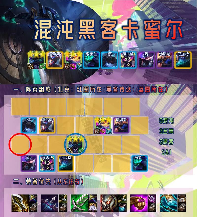 〖One〗、如有黑客/混沌转职,可6人口追卡蜜尔与派克三星。4-1升7人口,开4AI+3混沌+3至高天+2黑客羁绊,之后卡着30金币追卡蜜尔与派克三星。当卡蜜尔三星后,升8人口添加慎开3黑客。能上9人口则添加蕾欧娜开3混沌,扎克站在派克旁边开4黑客,以此构建强大的至高天AI青钢影阵容。