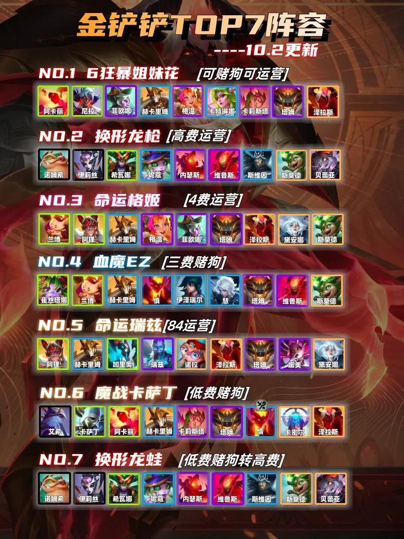 T0级:大头,赛娜 T1级:卑尔维斯,塞恩 T2级:阿狸,奎桑提 T3级:剑魔,瑞兹 从官方数据可以看出,大头登顶率比较高,而瑞兹则是最低的。这份榜单并没有统计英雄登顶时的星级。阿狸的登顶率非常高,因为她在三星时的强度非常高,大招能够直接清除敌人。