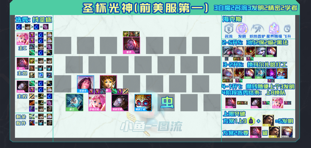 〖One〗、- 玩法要点:保持经济和血量健康,利息优先升级或搜牌。常规升级时间为3-2升6级,4-1升7级,5-1升8级。 强化符文分析 - 棋子专属符文:瑟庄妮的极冰寒狱与碎冰最优,蔚的拳击课程、西维尔的无尽披萨、加里奥的安全课程次之。