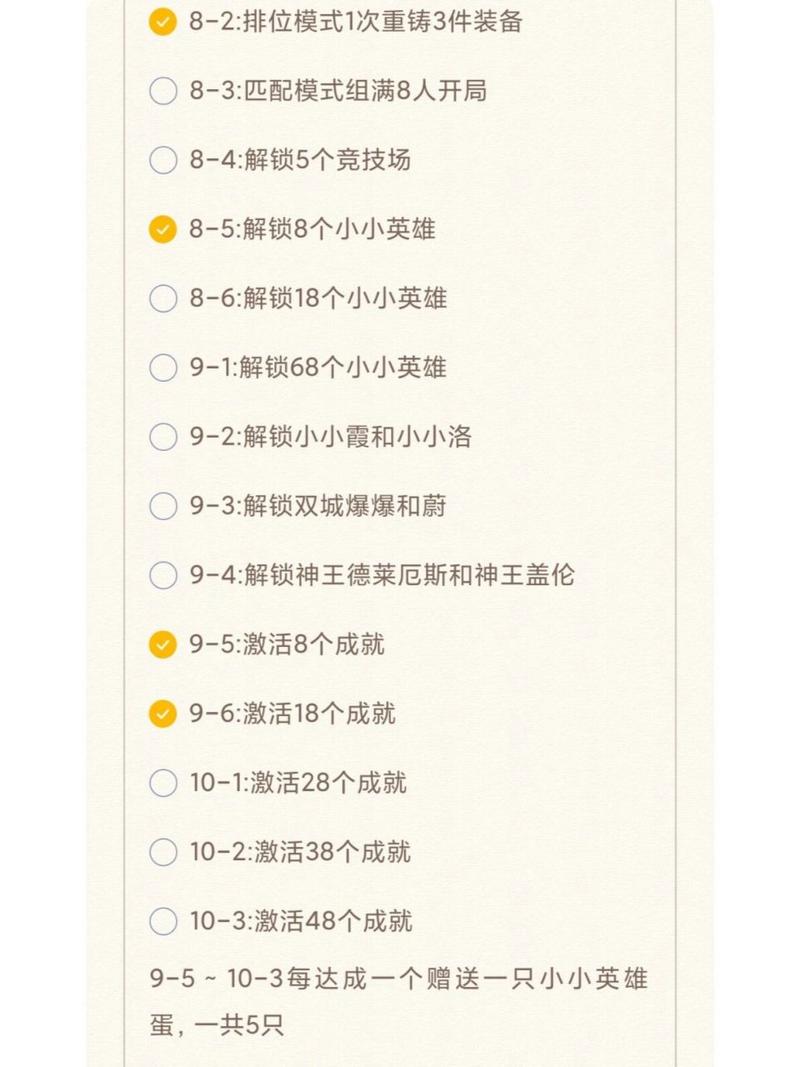 宝典达到满级。激活成就:激活8个成就。激活18个成就。激活28个成就。激活38个成就。解锁竞技场成就:解锁5个竞技场。解锁小小英雄成就:解锁8个小小英雄。解锁18个小小英雄。解锁68个小小英雄。