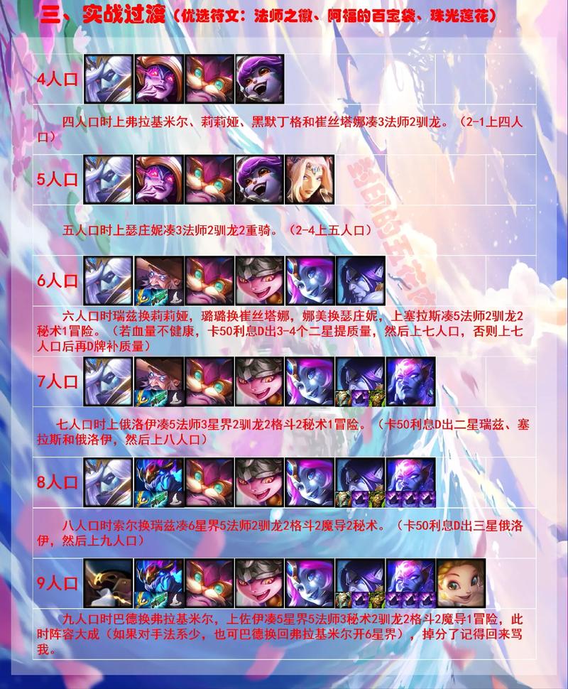 开局应抢无用大棒或女神之泪。确认是否玩这个阵容前,检查龙之天才是否法师。若不是,可考虑更换策略。通常从4-1或7开始构建,若非,则从3-2或6开始,寻找5和3星界。找到蛙妃后,维持连胜或连败,通常以青蛙妃子的装备开始。5人组合3条星龙、3个法师、2个战士。
