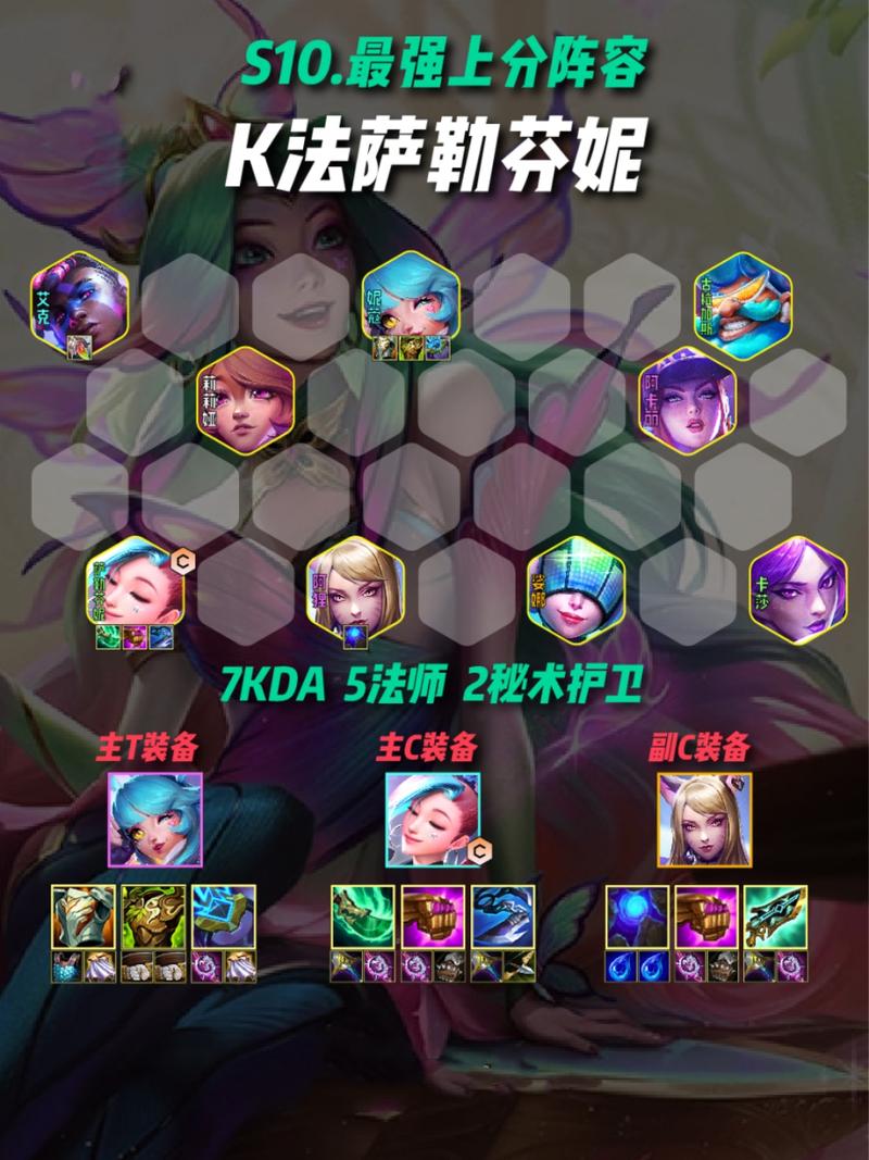 〖Three〗、传送门篇 多才多艺阵容 【萨勒芬妮+KDA】组合:7人羁绊,包含5法师、2秘术,优先考虑9人口补琴女,三星萨勒芬妮为关键,后期根据情况调整装备。【五杀刀锋天使】阵容:7人羁绊,3刀锋、3超粉,适合连败拉人口,天使三星后考虑上9人口补全羁绊。