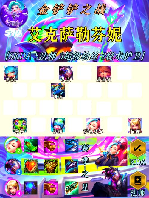 主要玩的就是5KDA+5法师+3超级粉丝羁绊,阵容属于多核输出阵容,前中期依靠萨勒芬妮群伤打输出,中后期来阿狸后来给阵容提供点杀能力。阵容前期主C萨勒芬妮,其技能不仅能造成高范围群伤,关键还能给碰到的友军回复中等生命值,可大幅度的增加阵容的续航能力,来弥补前排没三星的坦度不足的瑕疵。