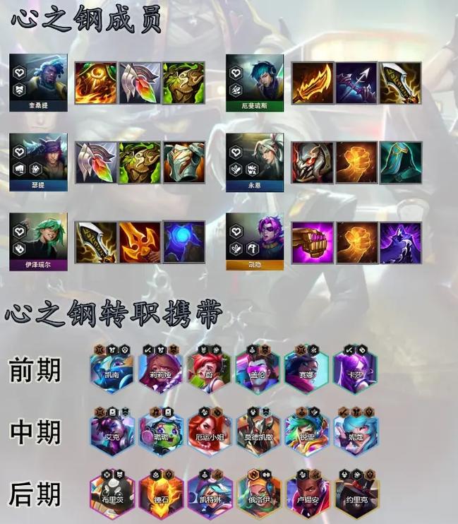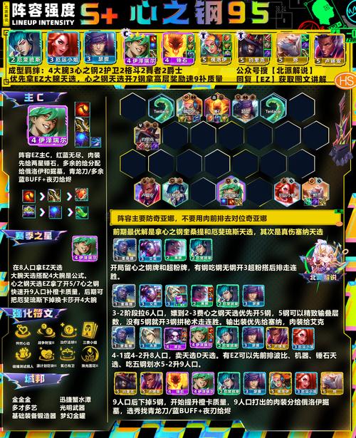 心之钢EZ阵容的基本构成如下:3心之钢、4大腕、2护卫、2疾射、2舞者、2斗士、2爵士。8人口时,固定上EZ、厄斐琉斯、腕豪这三个心之钢单位,剩余位置根据D卡情况来补充,如木木、锤石、扎克、波比等作为8人口时的正常前排。