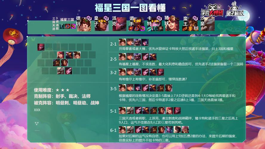 形成羁绊:福星羁绊是只有五个英雄但需要六个人才能完成羁绊的类型,因此必须拿到一个天选福星。组合搭配:由于福星本身缺少可以作为核心的英雄,所以可以搭配刺客形成福星刺阵容。前期策略:在没有形成六福星羁绊之前,可以采取卖连败的策略,以获得更多的经济和资源。