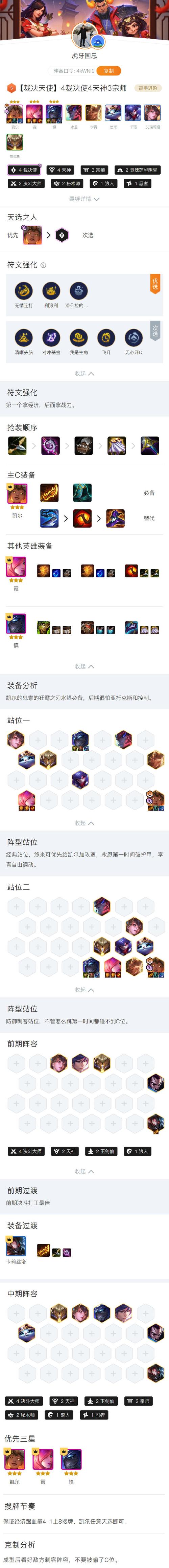 阵容组成:永恩、刀妹、武器、盲僧、肾、猫、霞、千珏、天使。阵容强度:成型必吃分,质量够高能吃鸡。核心装备:羊刀、火炮、旗子(千珏/霞)运营思路:①弓开局的话尽量走连胜,装备不需要抢的情况下。②开局可以三国豹女带装备,也可以看天选走。