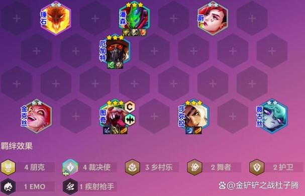 阵容组成包括凯南、蔚、潘森、妮蔻、锤石、金克丝、赛娜。在7人口时达到最佳阵容,若条件允许,可补充2星高费卡,或开启6护卫/4枪手羁绊。核心羁绊为4护卫4朋克2枪手。优先考虑转职为护卫纹章或疾射枪手纹章。金克丝作为主C,装备推荐无尽之刃+最后的轻语,最后一件装备可选取羊刀增加续航或巨杀提升伤害。