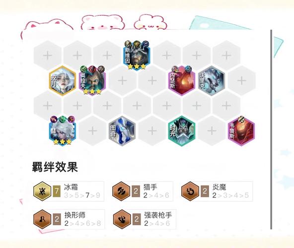 〖Two〗、吉祥物3至高天2怪兽的阵容中,核心角色包括薇古丝、石头人、龙龟、努努、莫甘娜、派克、牛头和烬。薇古丝作为主c,需要搭配蓝霸符和法爆装备,优先考虑巨杀,其次可以选取大天使或帽子。石头人适合装备狂徒、石像鬼板甲和龙牙,龙龟则需要日炎、吉祥物纹章和反甲。