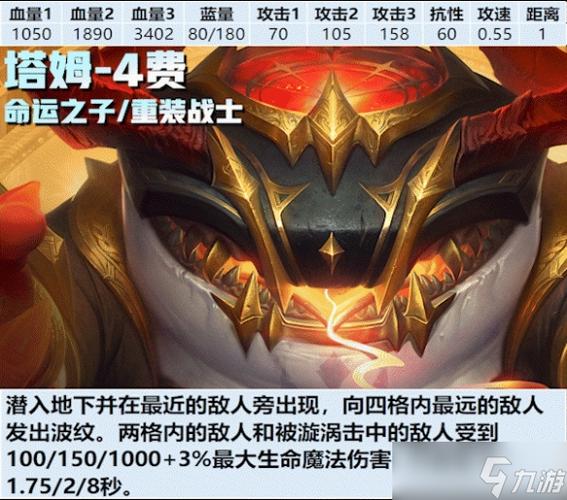 〖Five〗、塔姆在金铲铲之战中是一个重要的角色,他的特殊能力是吞噬其他英雄来提升自己的基础属性。吞噬高费用的英雄比低费用的英雄提升的属性更多,这使得玩家在游戏策略中更加倾向于选取高费用的英雄。同样地,吞噬高星级的英雄会比低星级的英雄提升更多的属性。