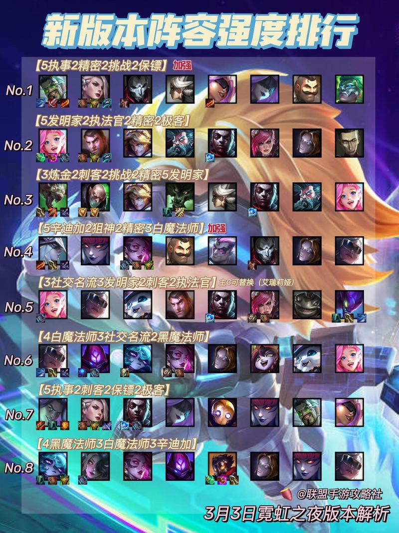 〖Five〗、狙神巢、香炉、白法银为天胡,方阵加成很大后排人人是坦,面纱可以免水银,锻炉光辉主要是要更好装备,其他的偏防御向即可。上面就是金铲铲之战霓虹之夜版本前十上分阵容推荐,想了解更多有关金铲铲之战的游戏攻略,或者有什么其他疑问的朋友们也欢迎关注深空手游网,笔者将在此带来实用的攻略。