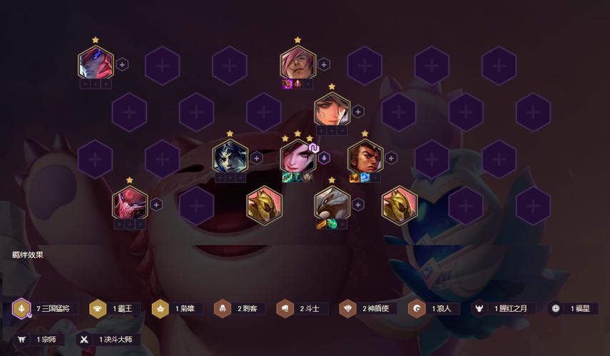 金铲铲之战中,三国卡特是一个以卡特琳娜为核心的阵容,依赖三国猛将羁绊提供的生命和法强加成来增强棋子质量。以下是这个阵容的玩法讲解:阵容构成:推荐阵容包括永恩、瑟提、蔚、派克、赵信、卡特琳娜、皇子和沙皇。如果有多余的装备,可以考虑给皇子装备日炎、冰心等防御装备,沙皇则可以选取攻速装备。