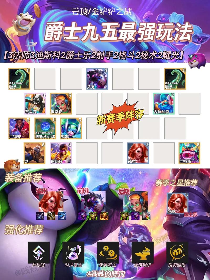 〖Five〗、阵容组成:在《金铲铲之战》中,3法师、3迪斯科、2爵士乐、2大碗射手、2格斗、2耀光使、2秘术护卫、1高能流行。装备选取:主C女枪带破甲、羊刀、巨杀,主T俄洛伊带适应头、狂徒、救赎。