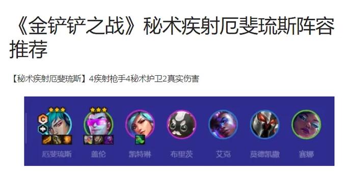 〖Four〗、阵容推荐:莎弥拉,艾克,厄斐琉斯,牛头,稻草人,蔚,瑟庄妮,努努,厄加特,组成羁绊蔚3秘术2吉祥2枪手。 强化符文选取:优选枪手之徽,利滚利,铤而走险;次选虚假前线,飞升,评级与交火,装弹完毕,复苏之风2。
