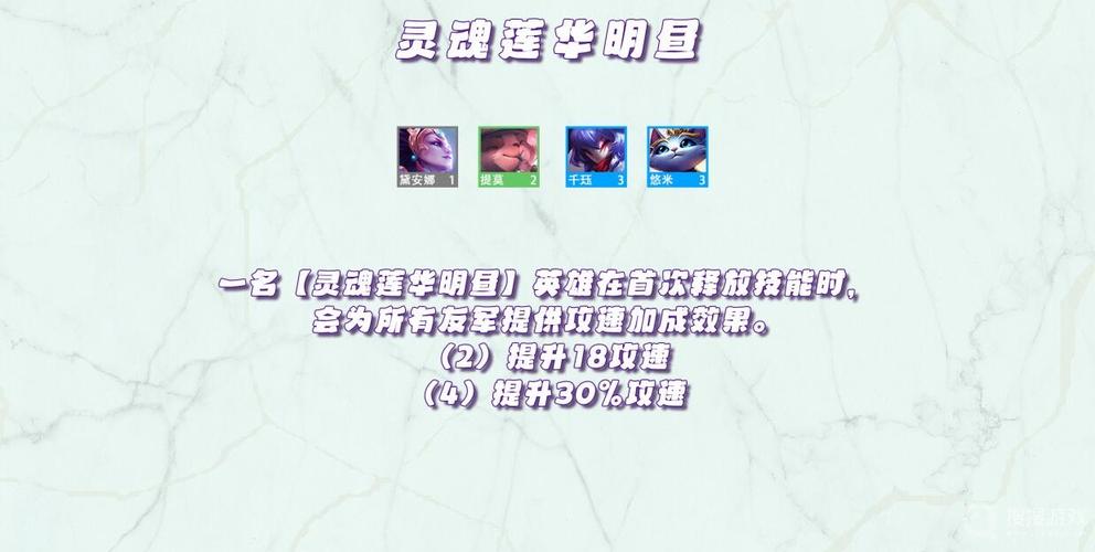 〖One〗、宗师 在战斗开始时,宗师会降低敌方50%的攻击速度,持续3秒。 重装战士 重装战士们获得额外护甲,2级提供100护甲,4级提供200护甲,6级提供500护甲。 月神 将星级最低的月神英雄增加1星,如果星级相同,则选取装备比较多的。3个月神英雄提升1星,5个月神英雄提升2星。