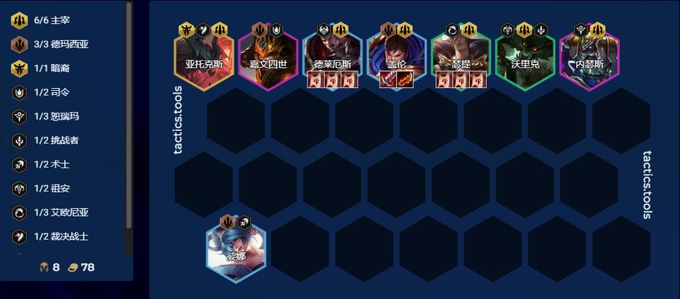 〖Two〗、运营思路:开局抢锁子甲,优先为卑尔维斯做泰坦装备。推荐使用下图所示的阵容进行前期打工。2-1拉4,2-5拉5,3-1拉6。根据血量和搜牌情况调整节奏。7人口之前不搜卡,7人口时,优先搜出2星卑尔维斯和其他2星棋子,确保阵容稳定性。若有额外资源,可提升至8人口,追求3星卑尔维斯以提升阵容上限。