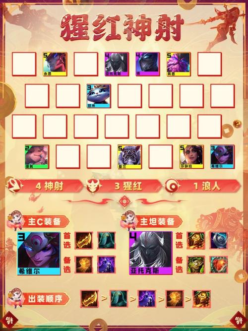 〖Three〗、金铲铲之战最肉阵容构建步骤:首先,在游戏开局阶段,尽量抢到弓箭,如果没有弓箭,则优先抢腰带。在游戏初期,应注重提升质量,稳定达到五级和六级。到达六级时,优先凑齐双极地的增益效果,将腰带和肉装装备给前排角色。