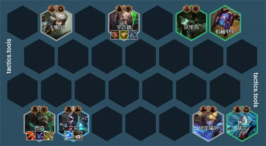 S6赛季赌老鼠拼多多阵容玩法思路阵容分析组成辛吉德,卡密尔,沃里克,伊泽瑞尔,基兰,图奇,艾克3炼金科技、2精密发条、2极客、2刺客、2挑战者、3发明家装备主C图奇:装备给上无尽,正义,轻语备选饮血,羊刀。副C卡密尔:装备给上狂徒铠甲,反甲,龙爪等肉装。