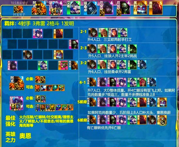 选取阵容:艾克,冰女,卡特,蔚,瑟庄妮,厄加特,大头,寒冰,这些英雄组成3皮城2祖安3弗雷尔的羁绊,以发挥各自的优势。 强化符文建议:优先考虑潘多拉的装备,组建强大的军团,争取胜利。