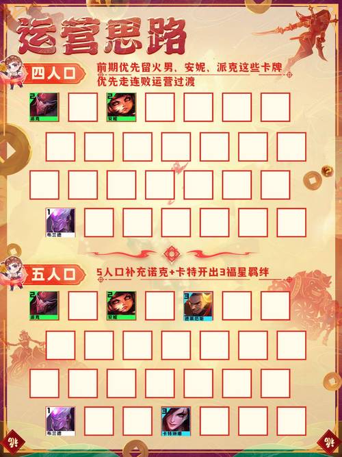 前期选取2-3个刺客搭配1-2个法师开始游戏。如果初期抽到关键的法师或刺客英双可以优先上场。中期扩展到至少4个法师羁绊,羁给法师提供足够的法术强度;另外再补充2-3个刺客维持输出。