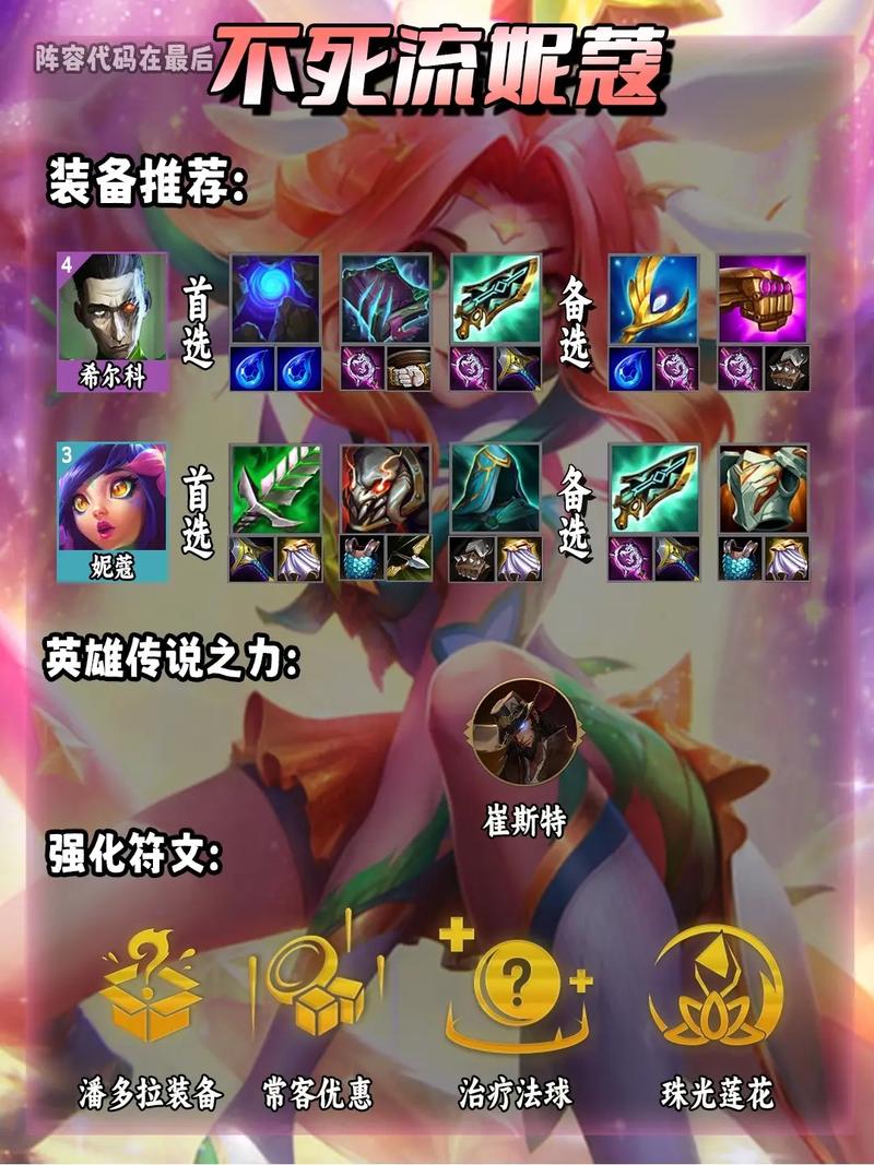 〖Three〗、阵容组成:纳尔『3』刀妹『4』金克丝『5』EZ『1』艾克『3』赛娜『3』萨勒芬妮『4』发条『4』。阵容羁绊:1宿敌 4极客 3社交名流 3发明家 2白魔 2强袭。海克斯强化:优选:极客转、废品厂、大天使之拥、名流之魂。备选:短兵之利、潘朵拉的装备、组件百宝袋、狩猎律动。
