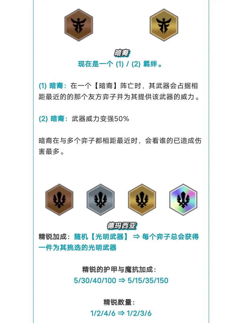 〖Six〗、新羁绊介绍 S9赛季中的暗影岛、亡眼射手、约德尔人等3个羁绊移除。S5赛季新增比尔吉沃特、以绪塔尔、征服者3个羁绊。其中S9赛季的暗影岛、亡眼射手的羁绊会替换成其他羁绊,并有几个棋子会增加新的羁绊。