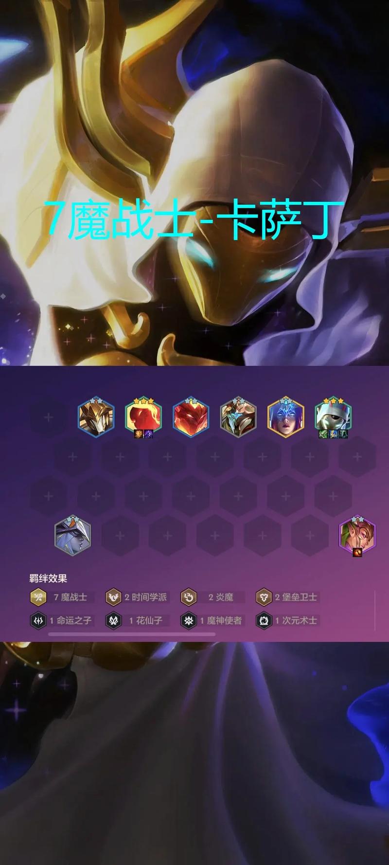 阵容搭配:核心阵容成员包括卡萨丁、南天之怒、青丘灵狐、皮城执法官等,这些英雄能够组成强大的羁绊,提升整体战斗力。阵容羁绊可以选取4狂野4斗士2虚空,这样的羁绊搭配能够增强卡萨丁的输出能力和生存能力。