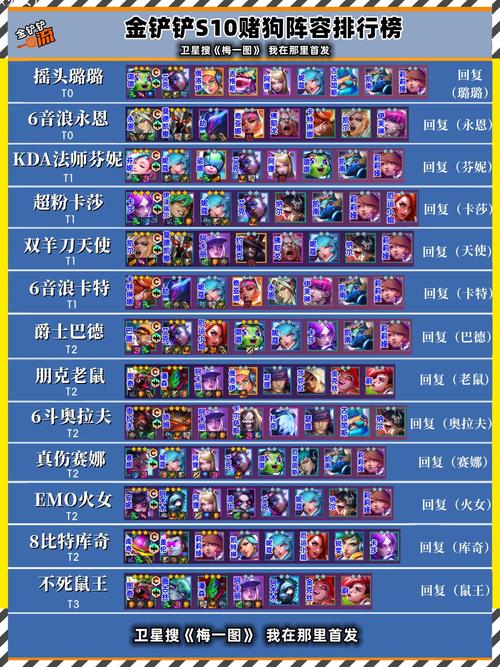〖Four〗、金铲铲之战S10鼠王薇古丝阵容,听起来就很酷对吧?这个阵容以老鼠和薇古丝为核心,搭配其他几个强力英雄,能打出爆炸性输出。下面是具体的玩法和阵容搭配推荐:阵容组成:老鼠薇古丝阿木木潘森阿卡丽莎弥拉卡尔萨斯这个阵容羁绊为6裁决使、2EMO、2朋克,确保了强力的输出和控制能力。