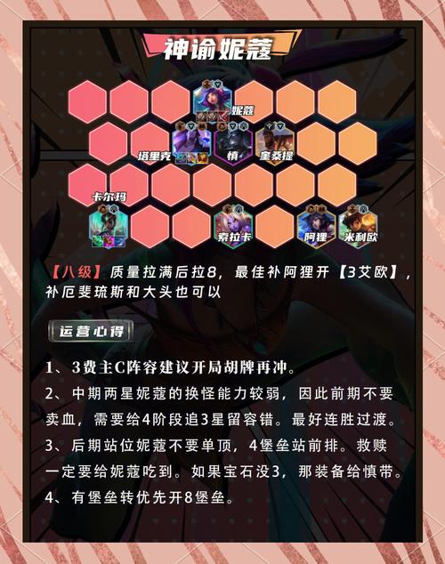 在游戏早期,可以通过选秀和野怪关卡获取关键装备和英雄,尽快激活虚空和刺客羁绊。中期阶段,要注意阵容的站位和英雄的星级提升,保证关键英雄的生存能力和输出环境。在后期决战中,要注意敌方关键英雄的位置,合理调整我方英雄的站位,以便更好地发挥刺客羁绊的跳转攻击优势。