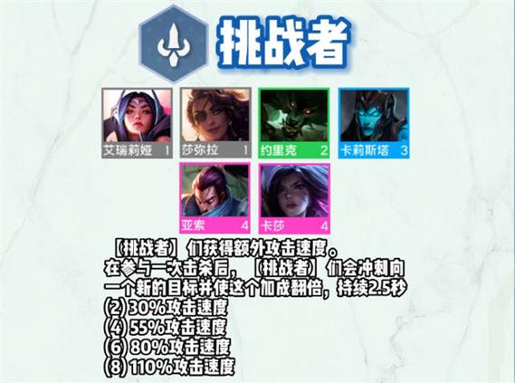 〖Four〗、挑战者转职合成 s6赛季中的道具「挑战者纹章」可以帮助角色进行转职,合成需要用到「金铲铲」+「反曲之弓」携带挑战者纹章的棋子可以被计算入挑战者羁绊,同时享受羁绊带来的加成效果。挑战者羁绊效果 挑战者可以提供额外的攻速,并且击杀目标后会冲向新目标,5s内获得双倍攻速加成。