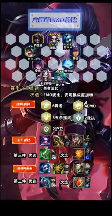 阵容构成:- 核心英雄:贾克斯、波比、阿木木、约里克、瑟提、纳尔、卡尔萨斯、安妮、薇古丝。- 站位安排:请借鉴下图所示站位。 羁绊效果:- 6舞者、4EMO、3五杀摇滚、2护卫、2裁决使。 装备推荐:- 波比(主C):饮血剑、泰坦、无尽之刃。