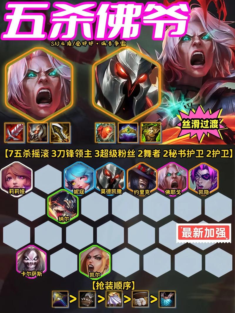 〖Two〗、《金铲铲之战》s8版本新羁绊阵容秘术斗士索拉卡玩法思路如下:阵容组成 索拉卡、蕾欧娜、锐雯、瑟庄妮、艾克、贾克斯、蔚、李青、布里茨。羁绊搭配 6斗士:提供额外的生命值和攻击力。 3秘术卫士:增加法术强度和魔法抗性。 2AI程序:根据AI程序的效果提供额外加成。