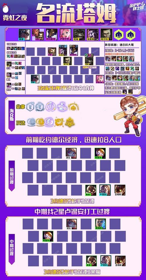 〖Two〗、金铲铲之战名流塔姆阵容玩法介绍阵容简析首先阵容组成羁绊:3名流 2极客 2白魔 2巨像 2保镖 2圣盾转职思路,建议名流纹章,可以去掉歌姬,后面9人口多出来的位置上猫咪。