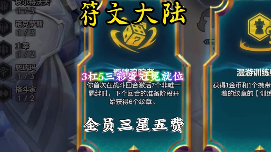 或者直接根据所给的转职纹章来确定后期的阵容。最后一套阵容是由诺姆希、狼人、兰博、龙女、金克斯、慧和乌鸦组成的,这个阵容也可以开出七个羁绊,它们分别是二龙族、二重装、二猎手、三冰霜、二强袭、二换形以及二强袭射手。这套阵容虽然需要三张三费棋子组成,没有前面两个阵容那样好追出七个羁绊。