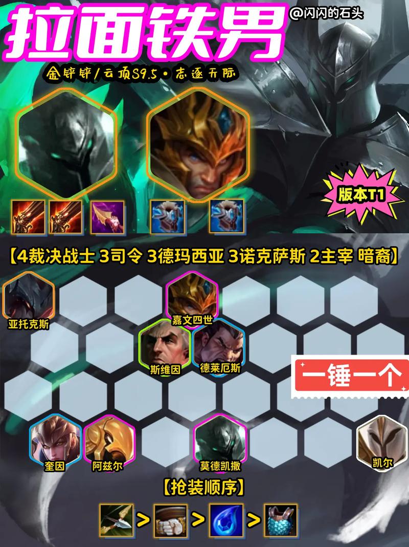 终极伊泽瑞尔作为核心c位,需要无尽之刃和轻语来提升攻击力。第三件装备建议选取正义之手,如果无法获取,则可选取科技枪或巨杀。 铁男的装备选取为狂徒铠甲,法爆和巨杀,以增强其生存能力和输出能力。