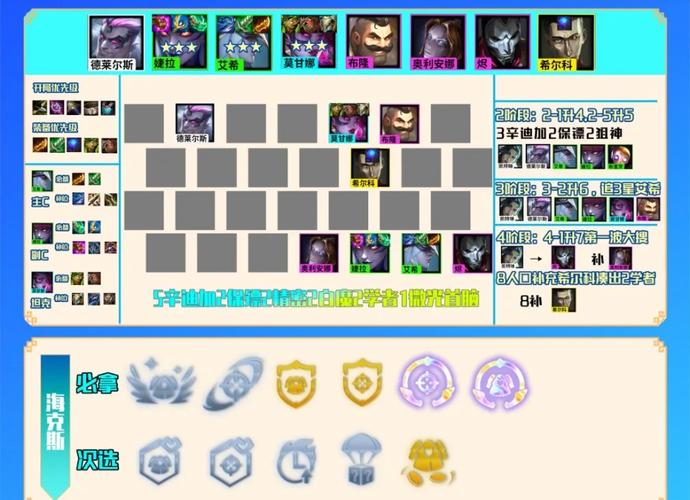 〖Four〗、阵容羁绊:这个阵容可以形成5山海、2狙神、2幽魂、2天将神谕、2护卫、2擎天卫、2法师的羁绊效果。这些羁绊能够极大地提升阵容的整体战斗能力。装备推荐:克格莫(大嘴):作为主输出手,推荐装备蓝霸服、珠光护手和灭世者之帽,以提升其输出能力。