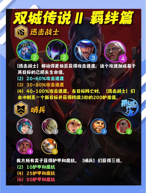 刺客:刺客羁绊能显著提高刺客英雄的暴击率和暴击伤害,适合针对敌方后排脆皮英雄进行快速击杀。 法师:法师羁绊增强法师类英雄的法术强度和/或施法次数,非常适合依赖技能输出的阵容。 战士:战士羁绊通常提供额外的护甲或生命值,增强队伍的前排生存能力。